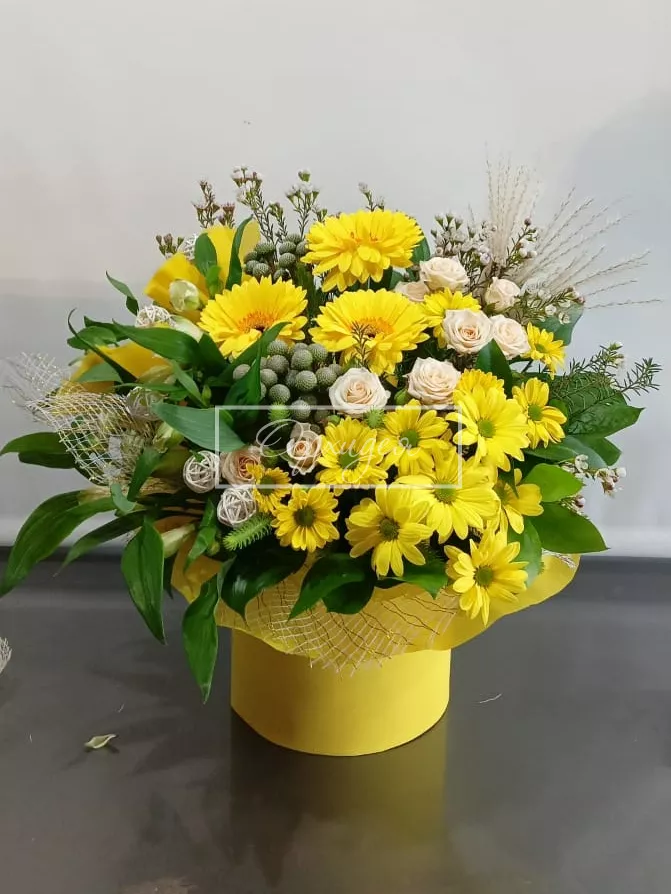 У моей коллеги сегодня был день рождения, и мы с коллективом решили порадовать её и заказали шикарный букет. Команда флористов качественно выполнила свою работу и теперь прекрасный букет стоит и радует нашу коллегу.