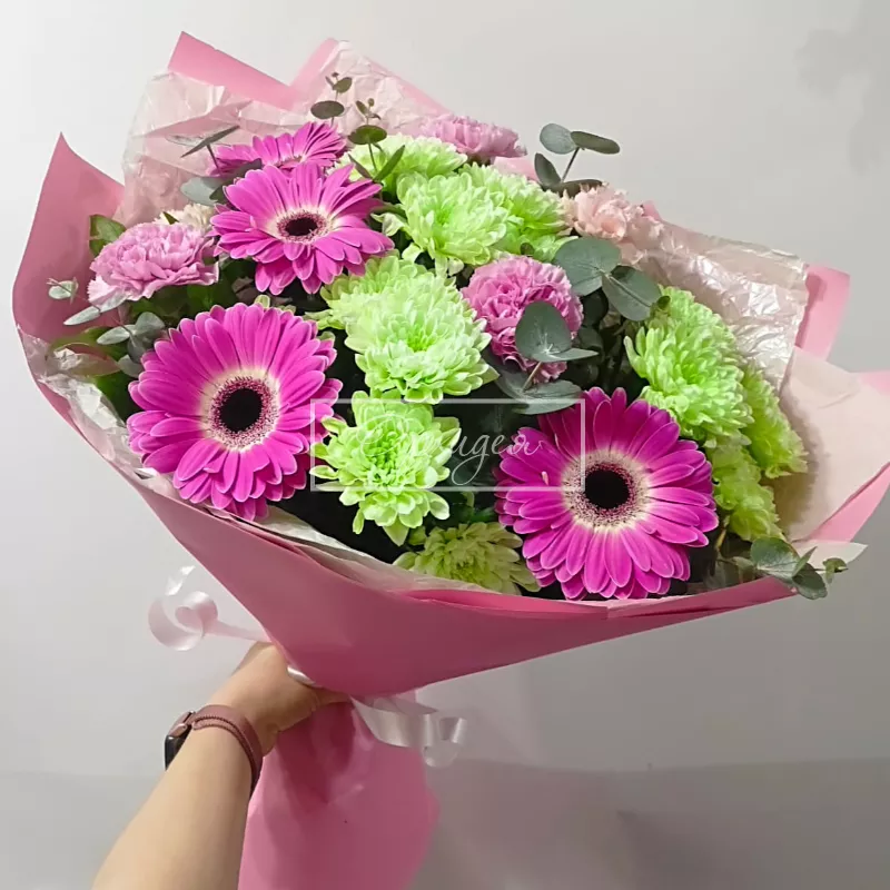 У моей коллеги сегодня был день рождения, и мы с коллективом решили порадовать её и заказали шикарный букет. Команда флористов качественно выполнила свою работу и теперь прекрасный букет стоит и радует нашу коллегу.
